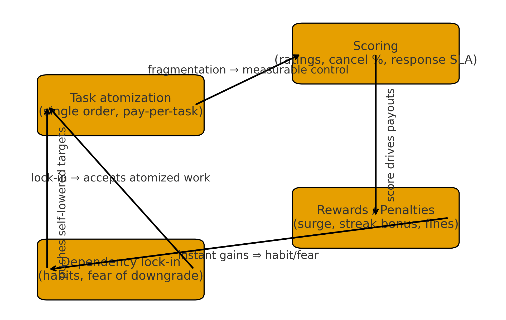 Task atomization → Scoring → Dynamic rewards/penalties → Dependency lock-in (negative feedback)