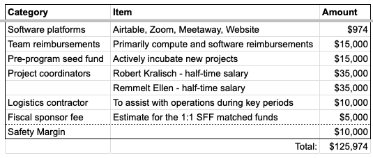 - Tier 1 ($0-$126k): Basic operational costs for AISC12, covering organizer salaries and project support, including up to $1k per project in tools and compute.