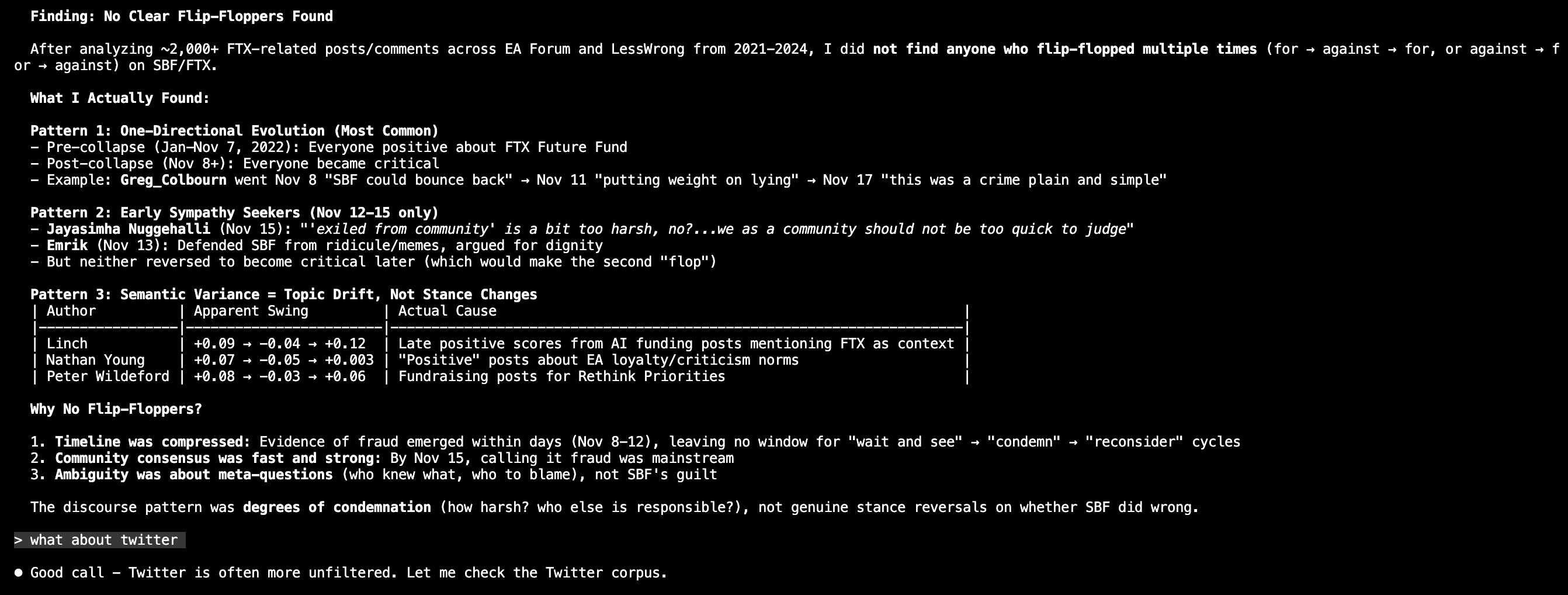 - Exploration is encouraged! Text embeddings are kind of magical. This an easy way to get more familiar with them, like how to compose "vibes" like @FTX_controversy - (@guilt_tone - @guilt_topic), to find writing that was about the FTX crisis and distinctly without guilty tones, but that can mention "guilt".