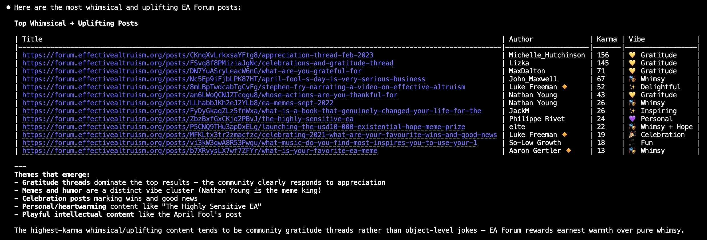 > the people who have had very uplifting and whimsical EA posts, how are they doing. does anyone seem like they could use support. followed up with: search for all of lesswrong, twitter, etc., of people who plausibly feel abandoned by EA. do sophisticated search.