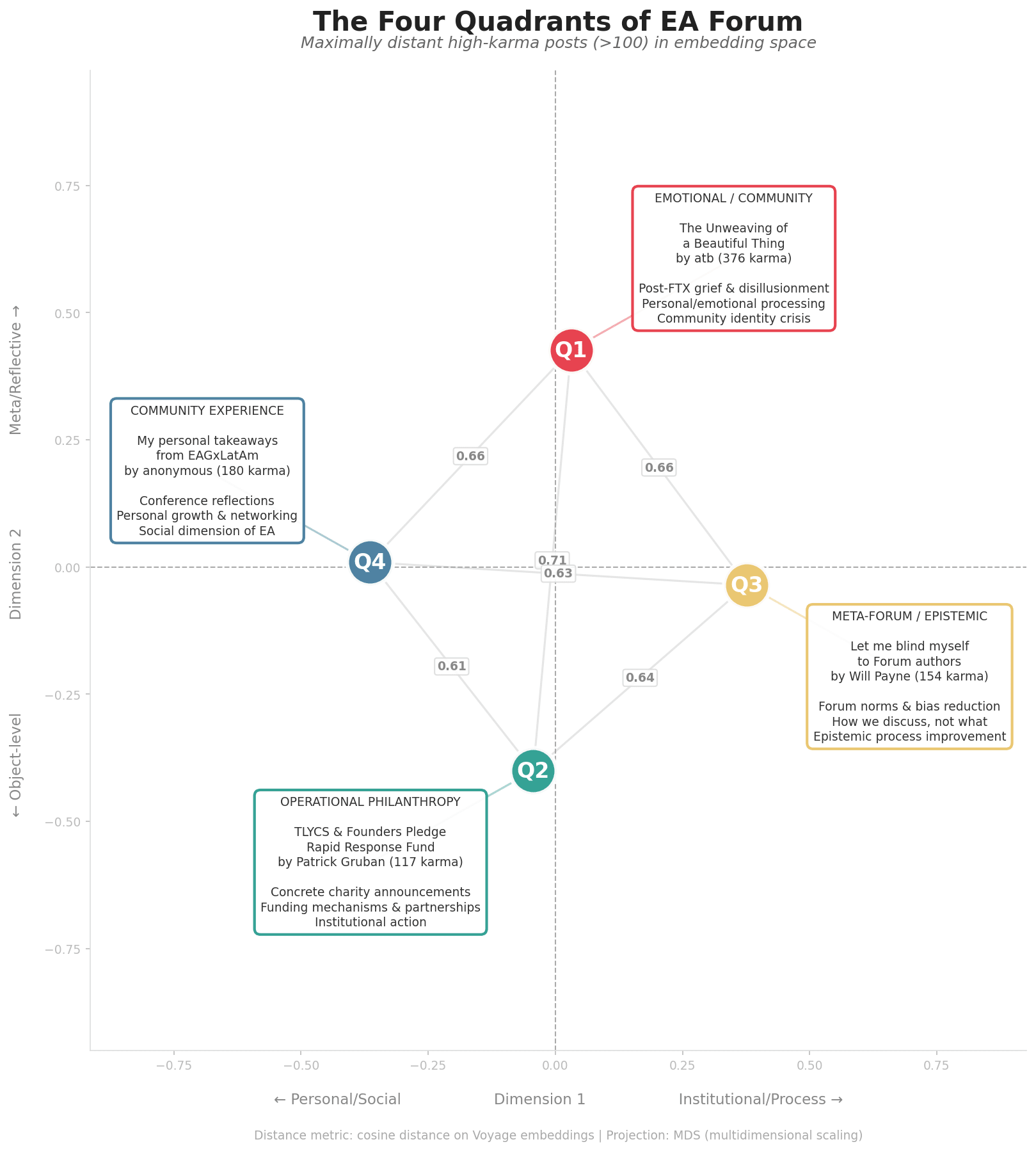 > find the 4 posts over 100 karma that are most distant from each other in every way (not the average of them). we want to create 4 quadrants.