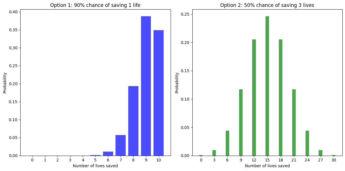 For example, after taking the first option 10 times, the probability distribution over amount of lives saved looks like this (on the left side). If they had instead took the second option 10 times, it would look like this (right side)