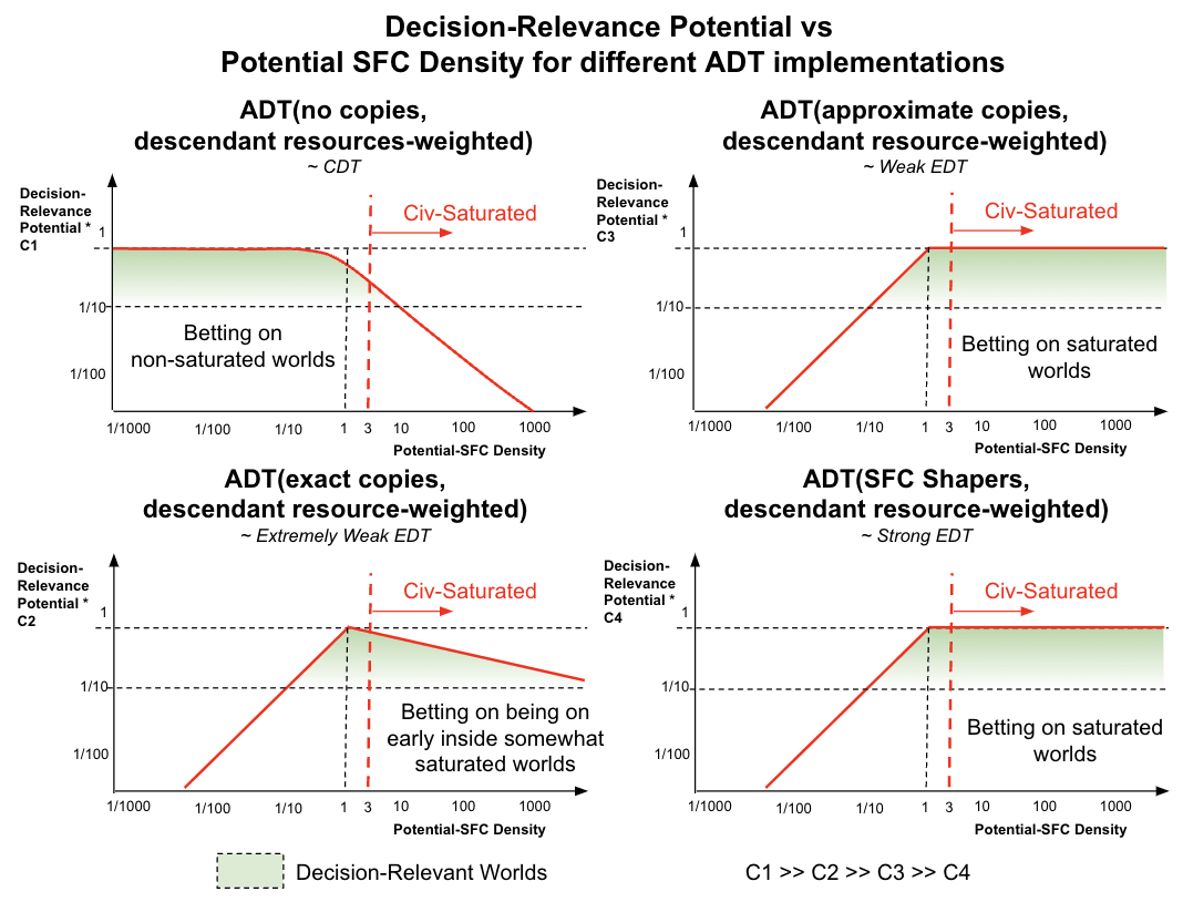 - ADT(no copies, descendant resource-weighted) - This ADT implementation ignores the impact of our exact copies (e.g., when assuming CDT) or assumes they don’t exist[28]. The worlds in which our descendants grab the most resources are those in which our SFC is alone. When the density of SFC reaches around one per reachable universe, then the Decision-Relevance Potential of these worlds starts decreasing somewhat linearly with the density.