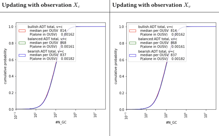 The X axis of the bottom plots is equal to the . The Y axis (of all plots), while named “cumulative probability” is actually the “cumulative decision-worthiness” defined in Cook’s post, which is equivalent to our Decision-Relevance we defined in Decision-Relevance of worlds and ADT implementations. The left plot updates on the Fermi-Observation (observable universe-wide, with information traveling at the speed of light ) while the right plot updates on observing the absence of aliens on Earth (information and aliens traveling at a speed lower than ). We will use the most conservative update, the Fermi-Observation. From eyeballing the bottom left plot, we can see that the expected is around 0.18. By using pixel areas to produce the same estimate, I arrive at , thus CSH would be 84% representative of reality. We keep this last estimate and follow the same process with the graphs for ADT(exact copies, count-weighted), AKA SIA, we get 90% in that case (eyeballing).