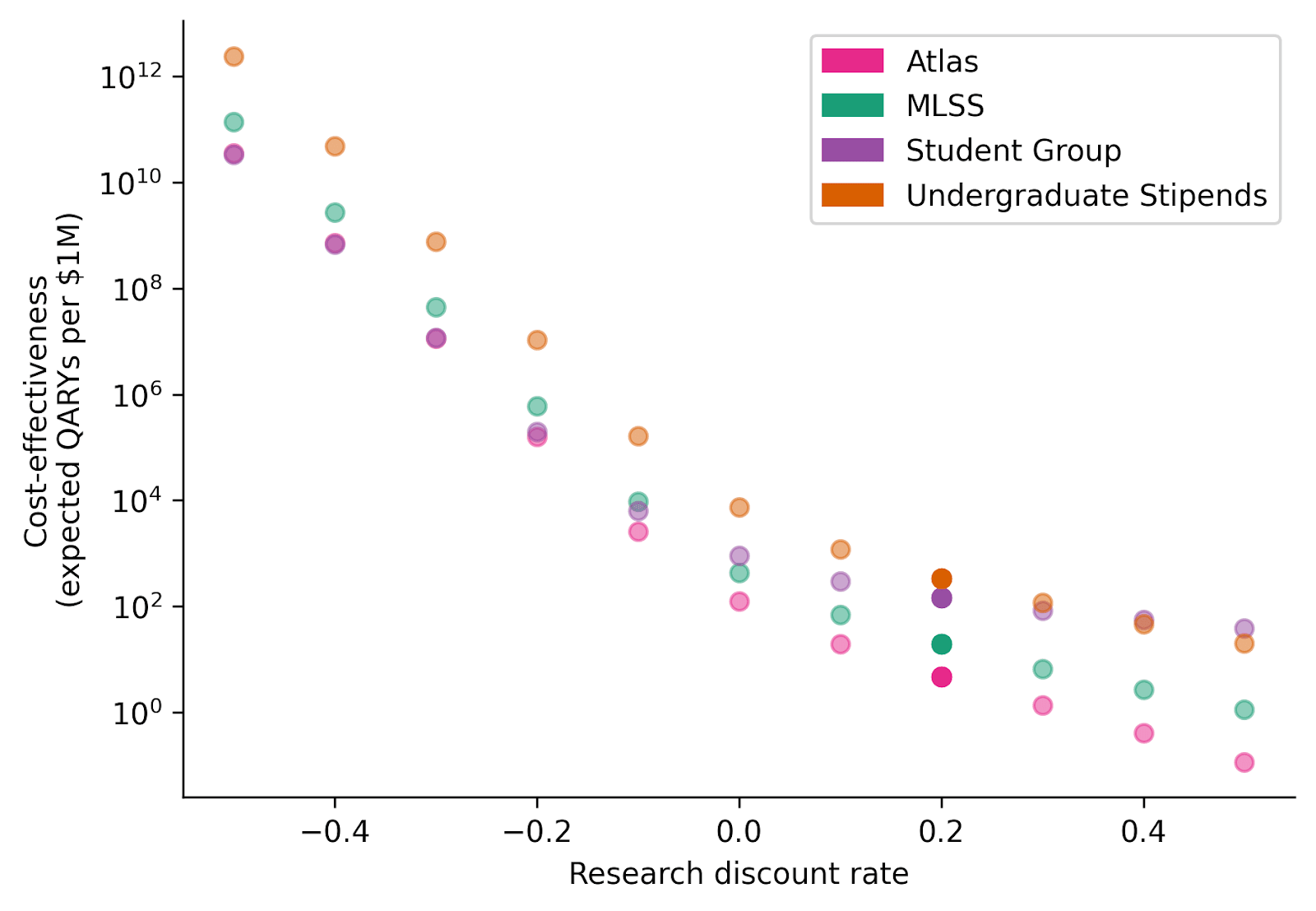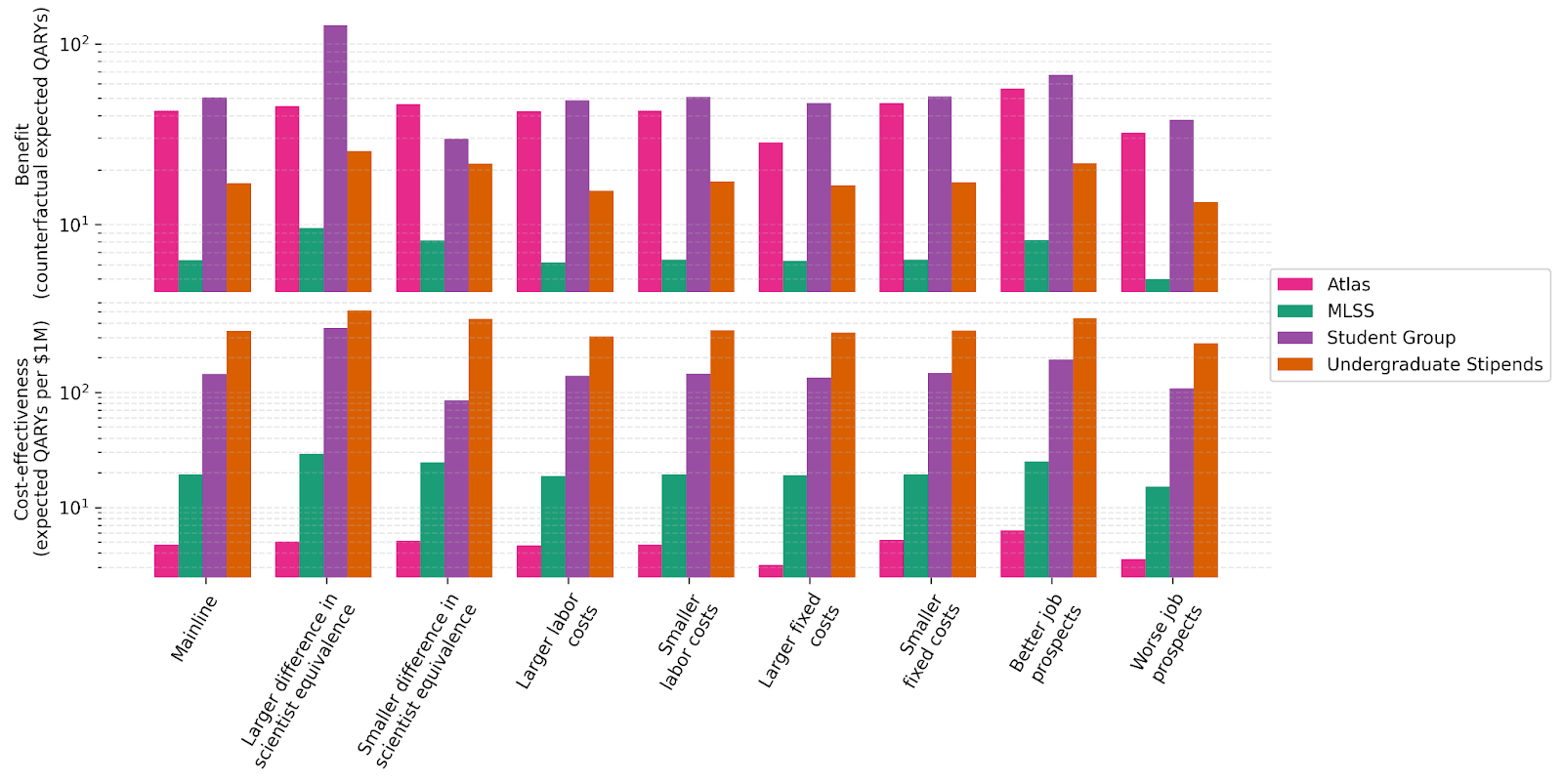However, these adjustments do not have nearly as dramatic an impact on the ratios of estimated cost-effectiveness between programs (relative cost-effectiveness). MLSS and Undergraduate Stipends experience a nearly identical ~50x decrease in cost-effectiveness. Atlas sees a ~70x decline, due to its participants beginning research relatively late; the Student Group sees only a ~20x decline, due to PhD students' research beginning relatively soon.