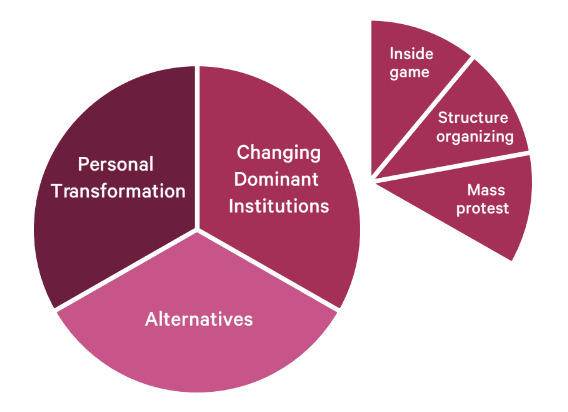 We could think about (partly overlapping) spectrums or portfolios of asks/demands, tactics, target audiences, and structures. I suspect a healthy social movement needs at least some groups at different positions on all of these.