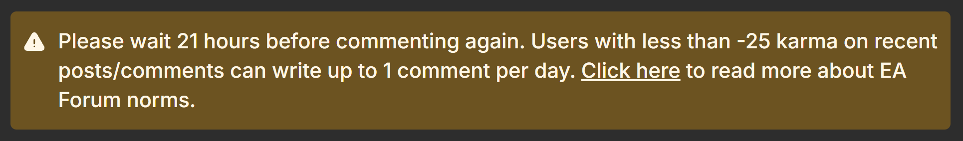 Rate limiting on the EA Forum is too strict. Given that people karma downvote because of disagreement, rather than because of quality or civility — or they judge quality and/or civility largely on the basis of what they agree or disagree with — there is a huge disincentive against expressing unpopular or controversial opinions (relative to the views of active EA Forum users, not necessarily relative to the general public or relevant expert communities) on certain topics.