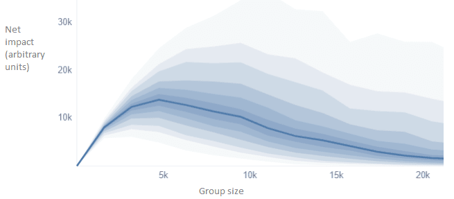 Here are two plots showing how the net impact (per year, with arbitrary units of impact) would change as a group grows — the plots are very different because the parameters are different and the model is very sensitive to that: