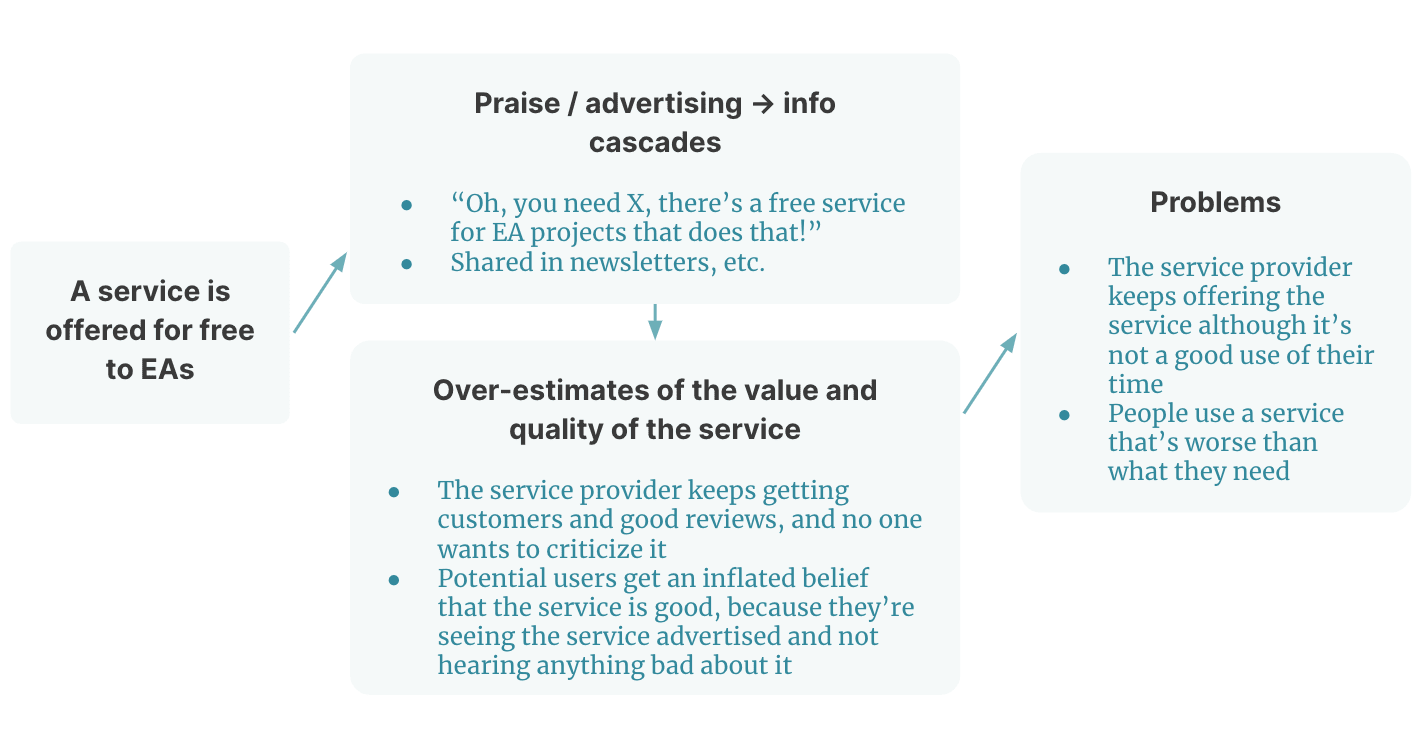 - Some potential service providers whose services would be really useful to projects in EA might not be able to offer them for free. If people are already using free services, newer projects won’t be able to compete even if they’d actually be better.