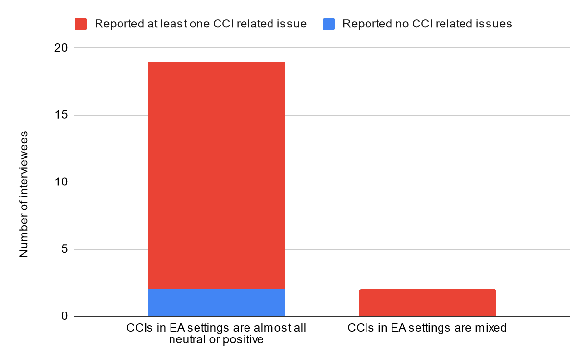 An overwhelming number of interviewees (19 out of 21) found their CCIs in EA settings to be almost all neutral or positive.