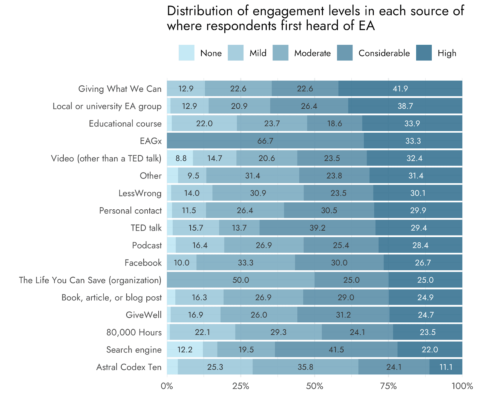 We also observed several differences between respondents low in EA engagement and those high in EA engagement[1]. Those low in engagement were more likely to report first hearing of EA via Astral Codex Ten (11.9% vs. 5.4%) and 80,000 Hours (18.2% vs. 13.9%). Those high in engagement were more likely to report a personal contact (19.9% vs. 15.6%), a local or university EA group (10.1% vs. 6.4%), and a TED talk (3.3% vs. 1.8%). Of these, the difference was largest for Astral Codex Ten, followed by 80,000 Hours, and a personal contact.