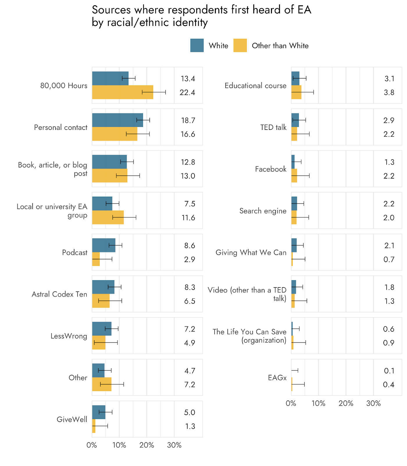 In contrast, non-White respondents were more likely to select 80,000 Hours (65% vs. 58.4%), the EA Forum (25.4% vs. 16.1%), the online EA community (13.5% vs. 7.4%), and EA Virtual Programs (12% vs. 5.8%).