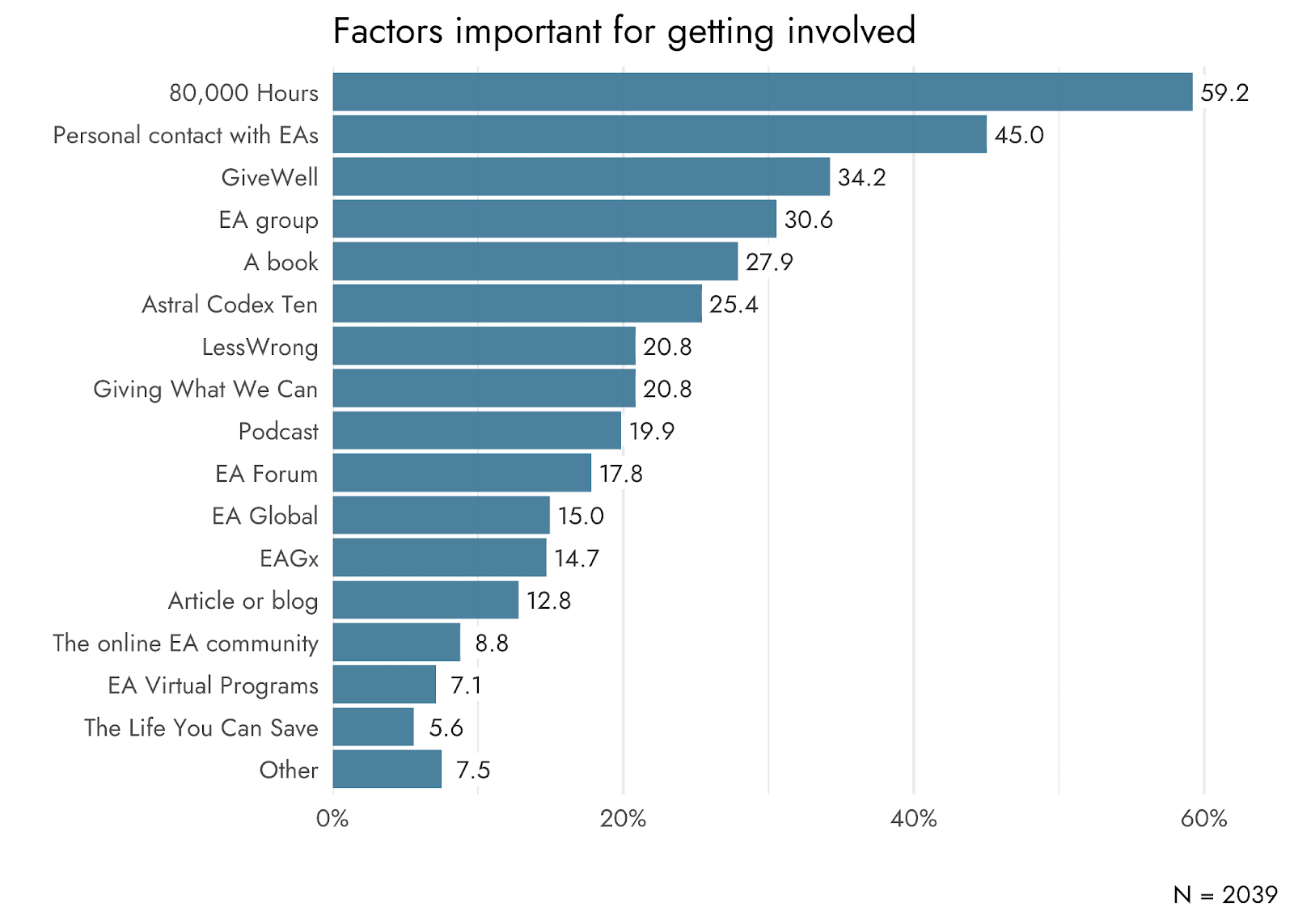 80,000 Hours was the most commonly reported factor important for getting involved (59.2%), followed by personal contact with EAs (45%), and GiveWell (34.2%).