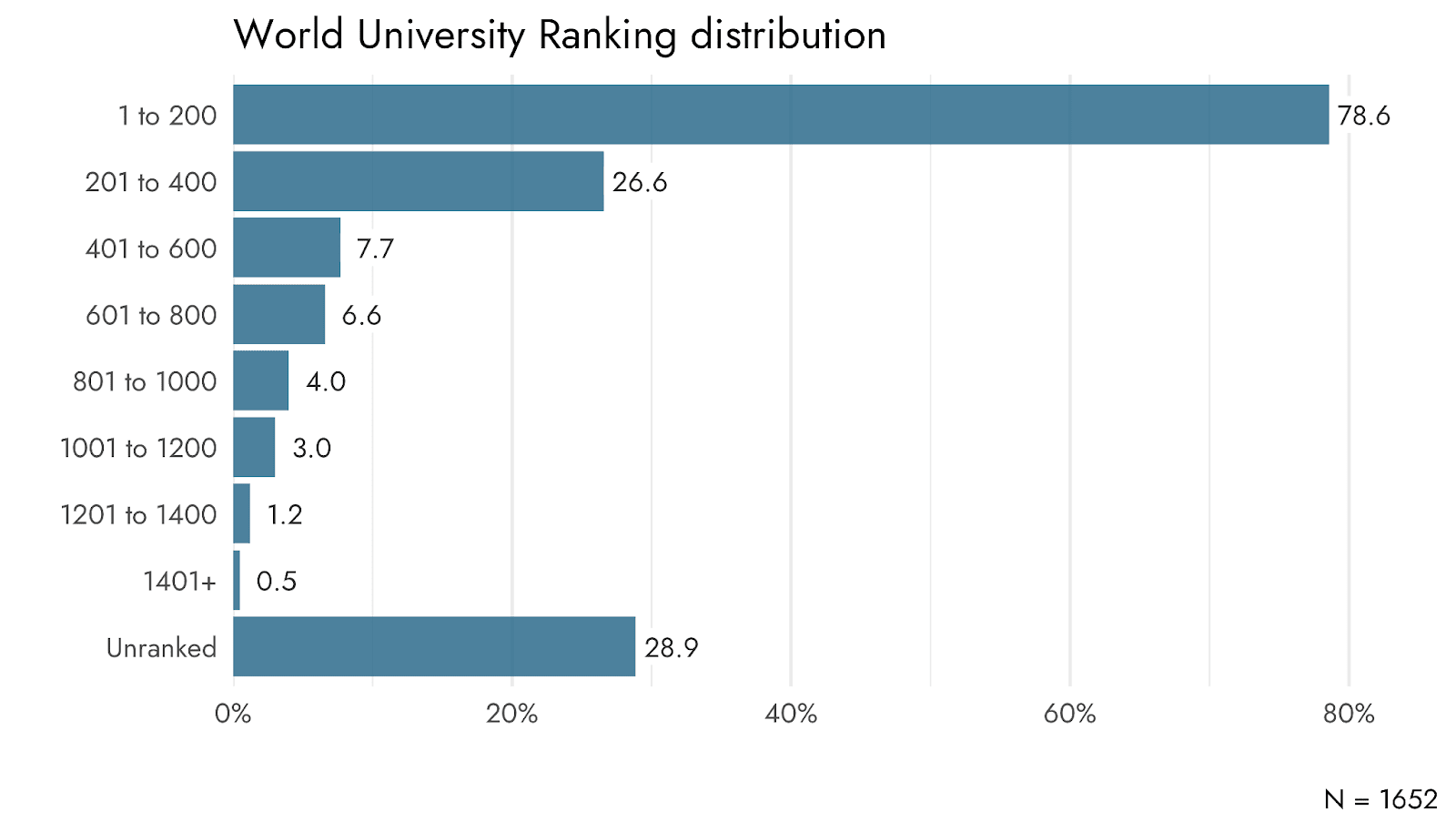 The high number of highly ranked universities is particularly visible when inspecting the proportion of universities by ranking category. The graph below shows that almost 80% of the respondents who reported a university report a university that is in the top 200.