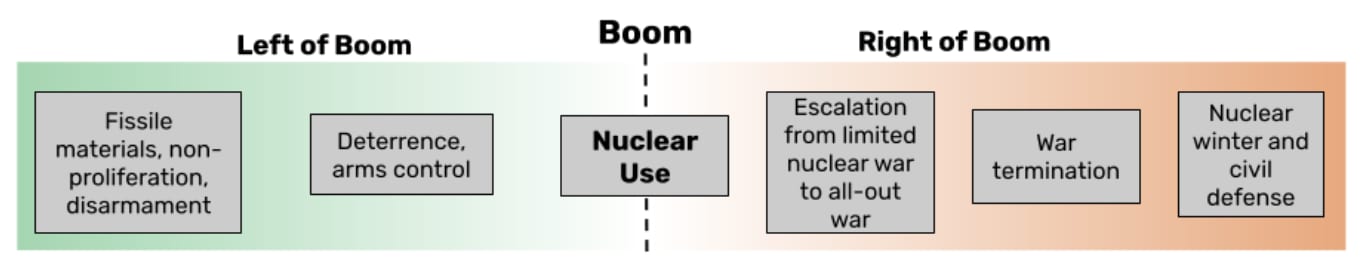 Most other organisations view “resilience” as everything “right-of-boom” (a term originating from the military), as illustrated in Figure 2 for nuclear weapons use. However, HI-Eng believe that building up civilisation’s resilience against these threats requires attention to both “left-of-boom” and “right-of-boom” interventions.