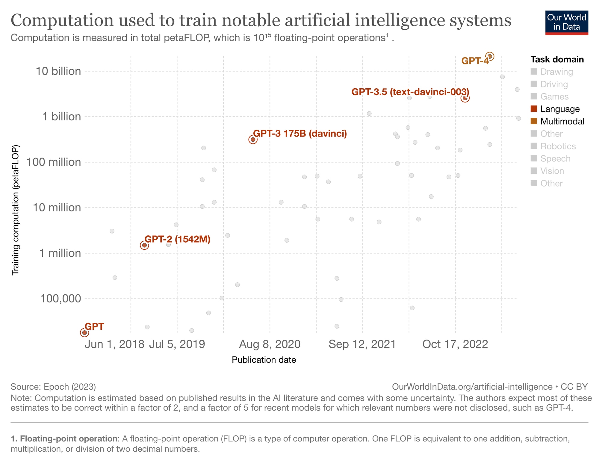 The graph pictured in the text is by Our World in Data, pulling numbers from our grantee organization Epoch, the original GPT was trained on 1.8e19 FLOP; GPT-2 was 1.5e21 FLOP; the largest version of GPT-3 (175 billion parameters) was trained on 3.1e23 FLOP, and GPT-4 was trained on ~2.1e25 FLOP. There isn’t clear documentation of GPT-3.5, the model in between GPT-3 and GPT-4, but we suspect that it was retrained from scratch and its effective training compute was order 10^24 FLOP.