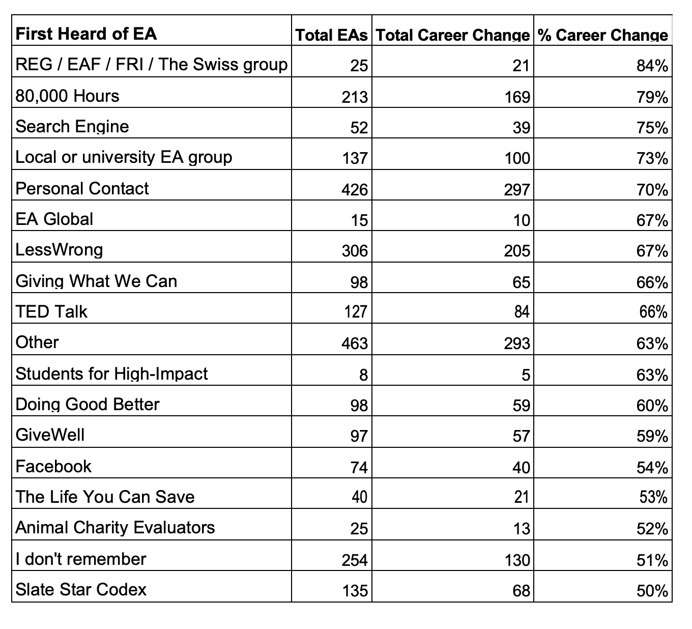 In general, there are very small raw percentage differences between career change and non-career change groups, across each route into EA. As the table below shows, moreover, more than 50% of EAs hearing about EA from each source either have changed their career plans as a result of EA or expect to. Of note, though, 80,000 Hours now seems to be over-represented, rather than under-represented, among EAs who have or expect to make career changes.