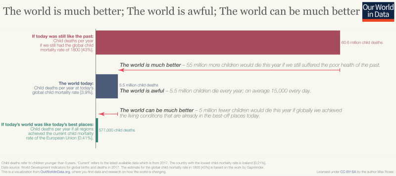 Here I focus on child mortality, but the same can be said for many aspects of global development. There are many aspects of development for which it is true that things have improved over time and are terrible still, and for which we know that things can get better.