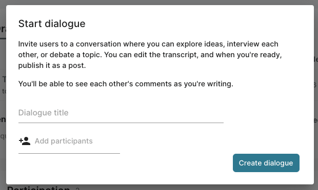 Title your dialogue. You can change this later. Add the participant(s). (You can add more participants later.) Click “create dialogue”. The other participants will get notified.