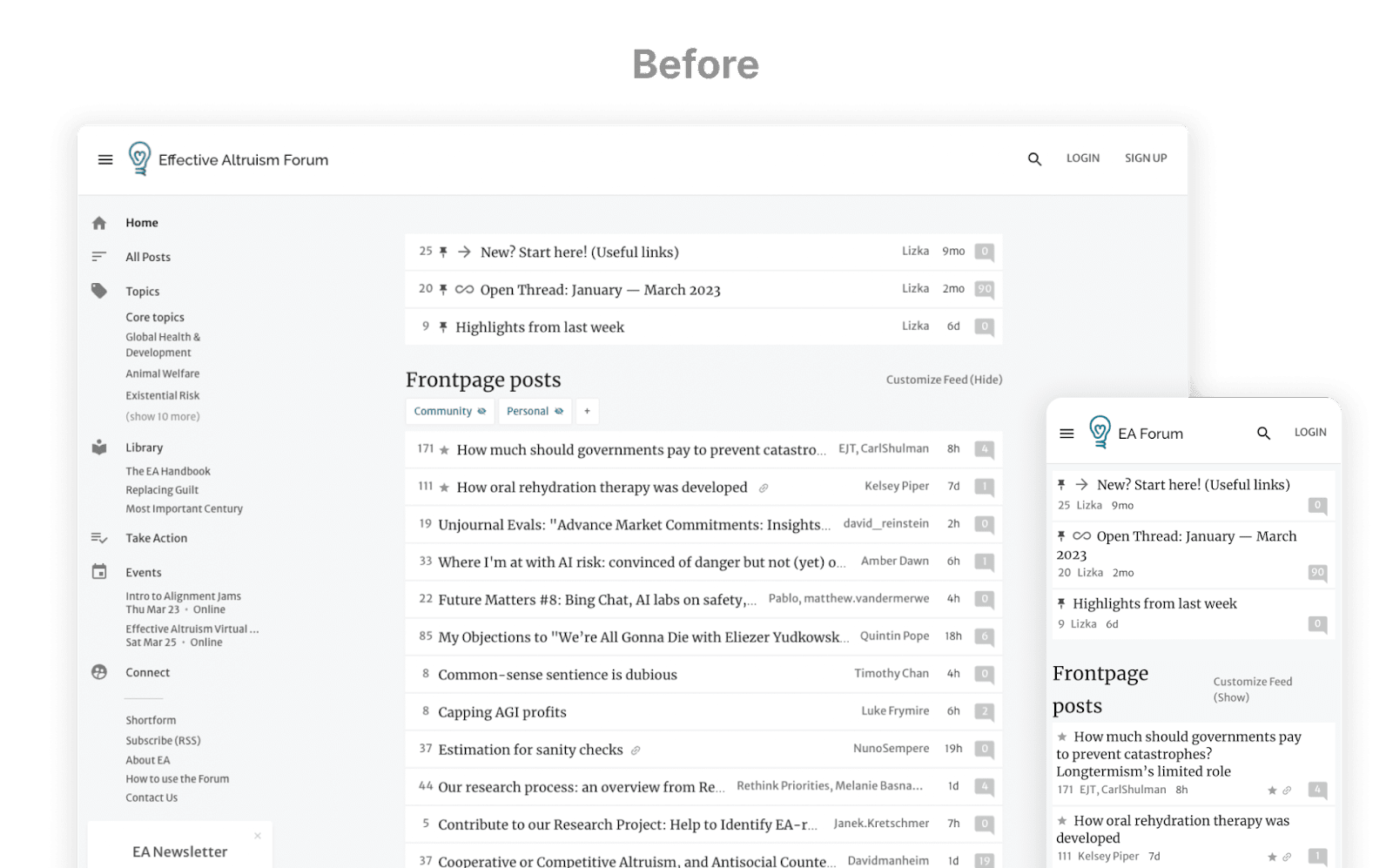 Some people expressed a worry that having a section like this would hide discussions that the community needs to have, like processing the FTX collapse and what we should learn from it, or how we can create a more welcoming environment for different groups of people. We were also pretty worried about this; I think this was the thing that I thought was most likely going to get us to reverse the change.[4]