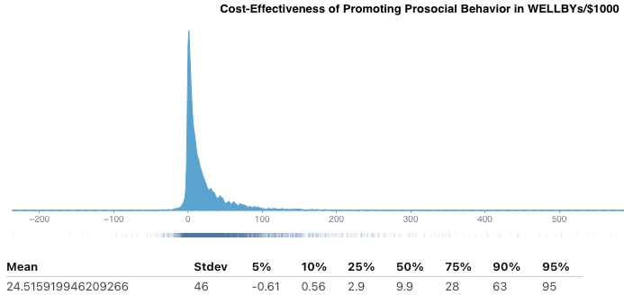 Our analysis indicated that there is still a lot of uncertainty about the cost-effectiveness of promoting prosocial behavior. Based on our findings, it is possible this intervention could be as cost-effective as the best GiveWell charities. Whether this prediction is correct is an open empirical question that can be answered by running an RCT. Is it worth running an RCT to find out? In our next post, we extend our method to try to answer that very question.