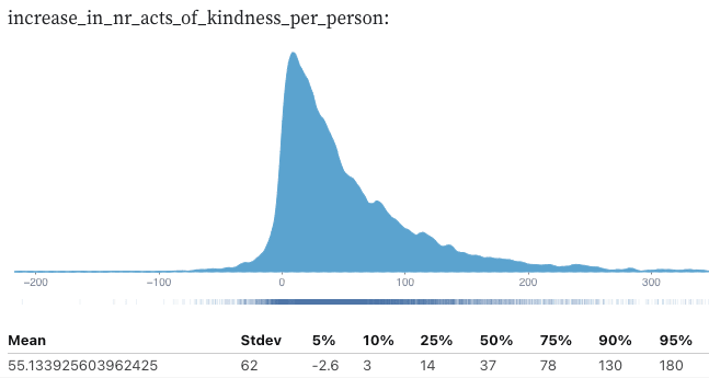 The purpose of this post was to illustrate that our rigorous method makes it possible to predict the cost-effectiveness of new interventions for inspiring others to do more good. Our results suggest that promoting prosocial behavior through scalable online interventions could be a cost-effective way to increase well-being. We, therefore, believe that this potential cause area is worthy of further investigation. The method we used to obtain these results extended standard cost-effectiveness analyses in three crucial ways: First, it predicts the cost-effectiveness of an intervention that has never been delivered at a large scale. Second, it quantifies the uncertainty about the intervention’s cost-effectiveness in a highly principled manner. Third, while most previous cost-effectiveness analyses assessed different ways of doing good directly, we assessed the indirect route of inspiring others to do more good. Our analysis, thus, provides proof of concept that it is possible to predict the cost-effectiveness of activities that improve social welfare indirectly by changing other people’s behavior. This post only provides a very short summary. If you want to know the details and see the underlying model and analysis, you can look at the Observable notebook we used to create this analysis.