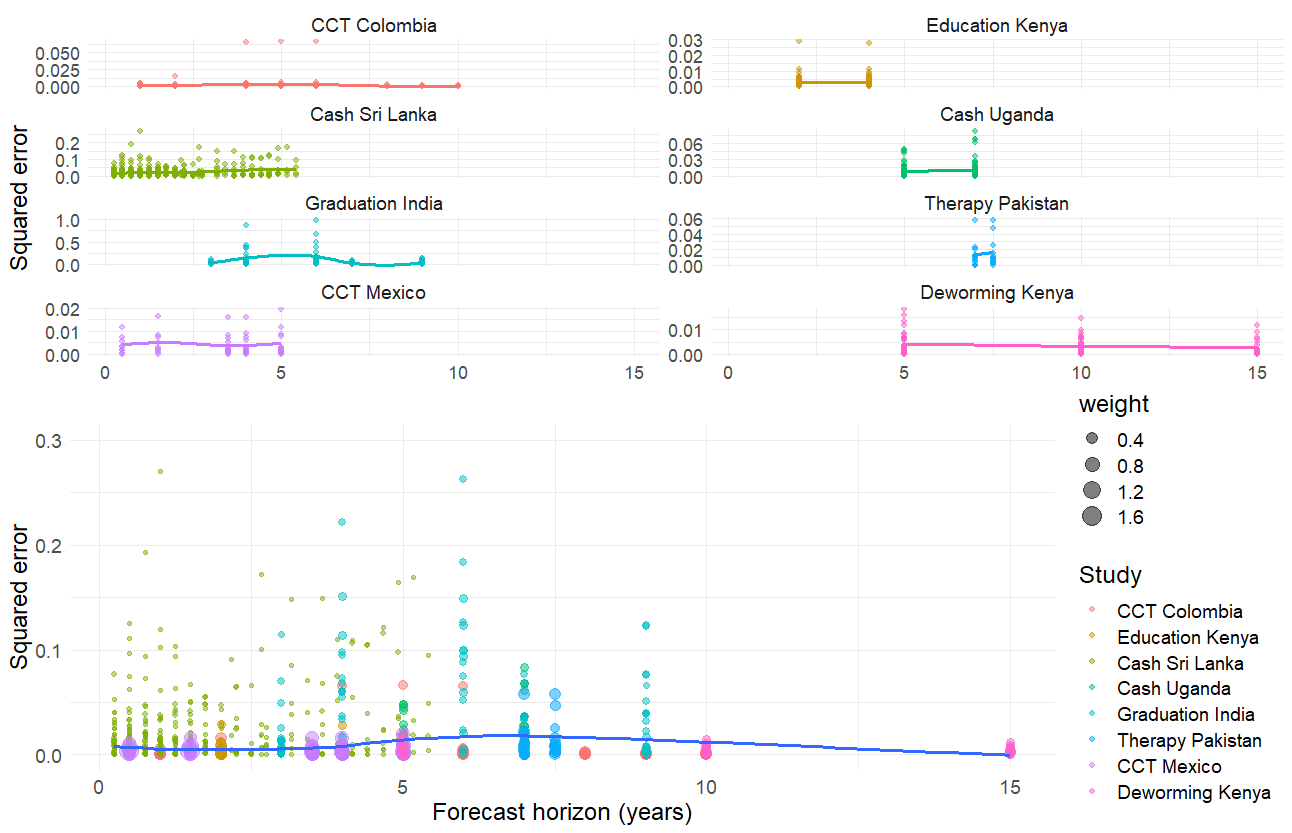 Notes: Loess plots are used in each graph to flexibly plot the relationship between forecast horizon and mean squared error. The loess is weighted by the inverse of the standard error in all graphs. In the combined graph, weights for each study are further adjusted by multiplying by the inverse of the number of forecasts, to give all studies equal weight. In the combined graph, the y-axis is limited to 0.3 to improve readability, cutting off a few of the larger squared errors from Graduation India.