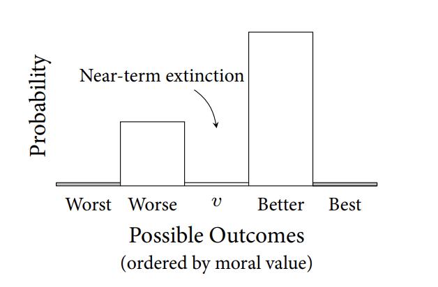 However, Kosonen argues Tail Discounting doesn’t ignore the possibility of extinction because extinction plausibly doesn’t sit in the tails—a world worse than extinction[3] is likely enough, and a world better than extinction is likely enough (see Figure 2).