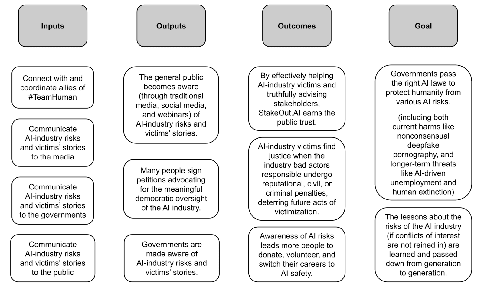 Please consider donating, kickstarting the petitions, and connecting us with AI-industry victims who need their voices heard (via our “Submit an Incident” form). And most importantly, please spread the word about StakeOut.AI! We need all the help we can get.
