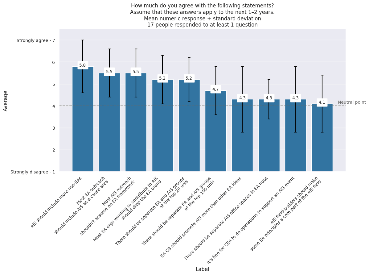 - Disagreements in overlap between EA and AIS infrastructure: Respondents were uncertain whether there should be separate AI safety office spaces in EA hubs and whether there should be separate EA and AI safety student groups at the top 100 universities, but a majority agreed that there should be separate EA and AI safety student groups at the top 20 universities.