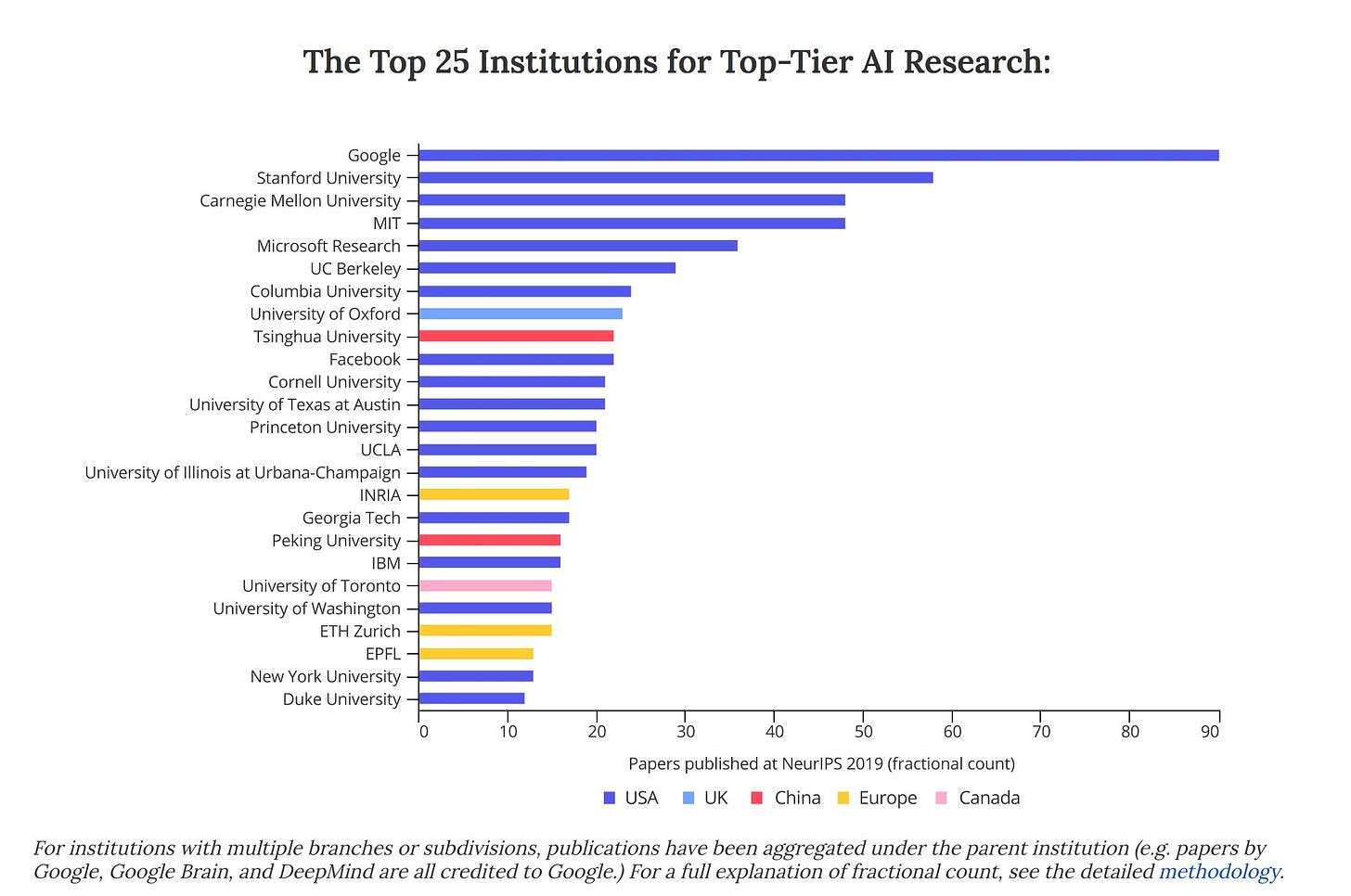 - Market dominance: Google dominates the field of AI, surpassing all universities in terms of high-quality publications: