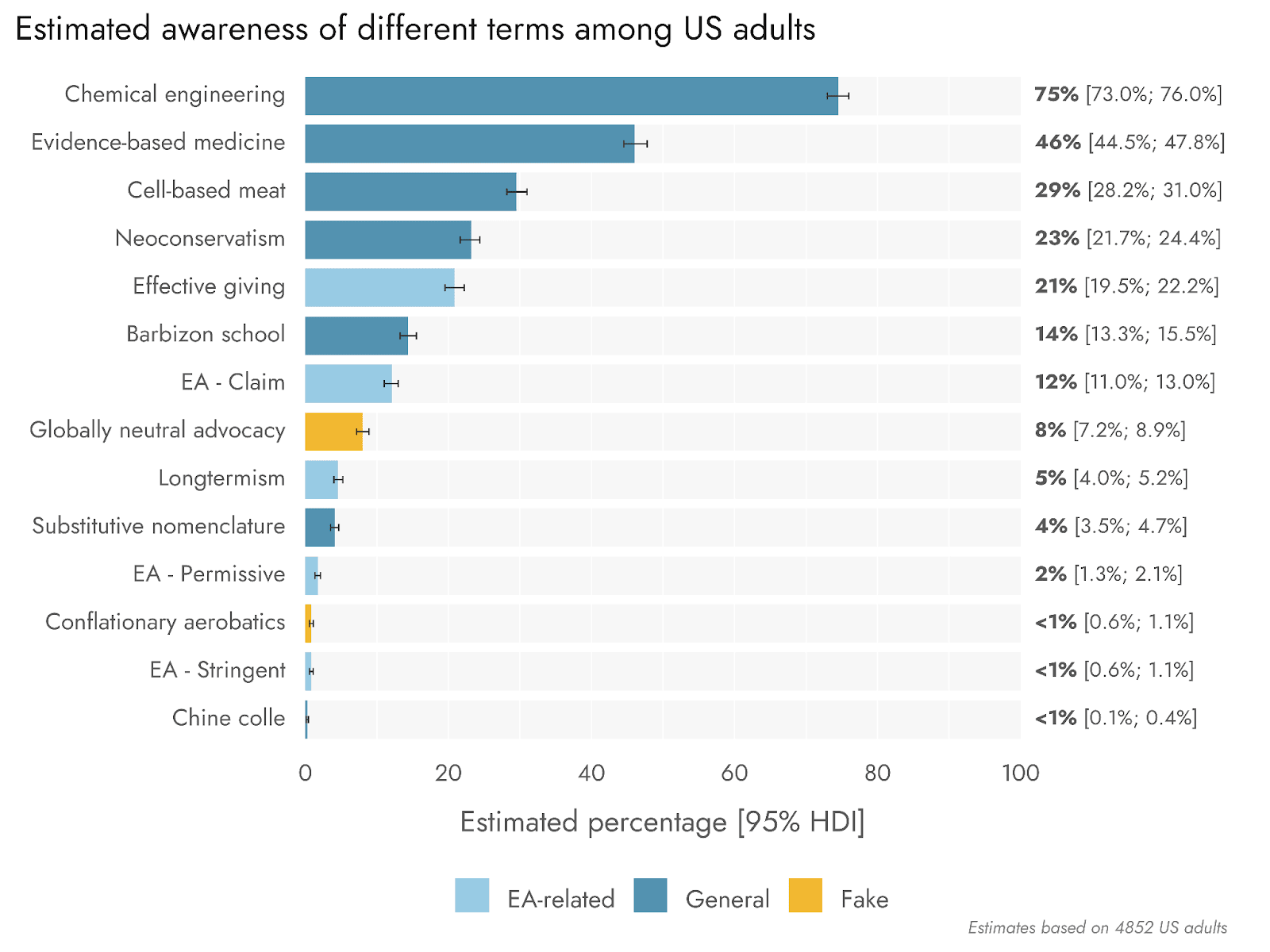 Besides Effective Altruism, we asked respondents about several other items. Longtermism and Effective giving were chosen as being relevant to Effective altruism. Other items function as reference points (e.g., relatively science-related or intellectual terms such as Evidence-based medicine) or as lures with which to gauge the likelihood of true awareness (e.g., Globally neutral advocacy is a made up term that, similarly to Effective altruism, people might be tempted to claim they know owing to recognizing the constituent words).