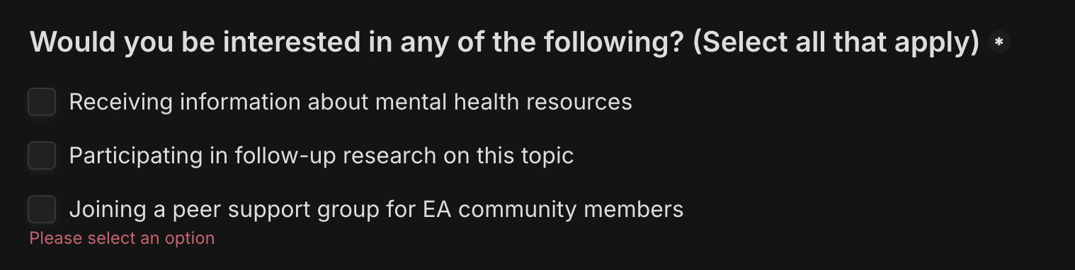 Thanks for doing this. This question is marked as required but I think should either be optional or have a "none" option: