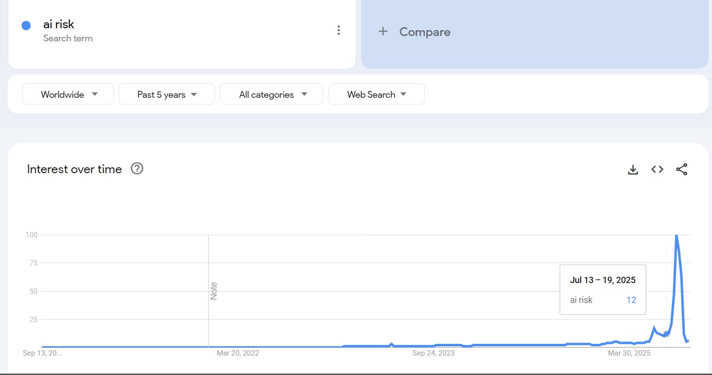 The MechaHitler incident seems to have worked as something of a warning shot, Google interest in AI risk has reached an absolute all time high. Trump's AI plan came out on the same day but the comparisons suggests Grok accounts for ~70% of the peak.