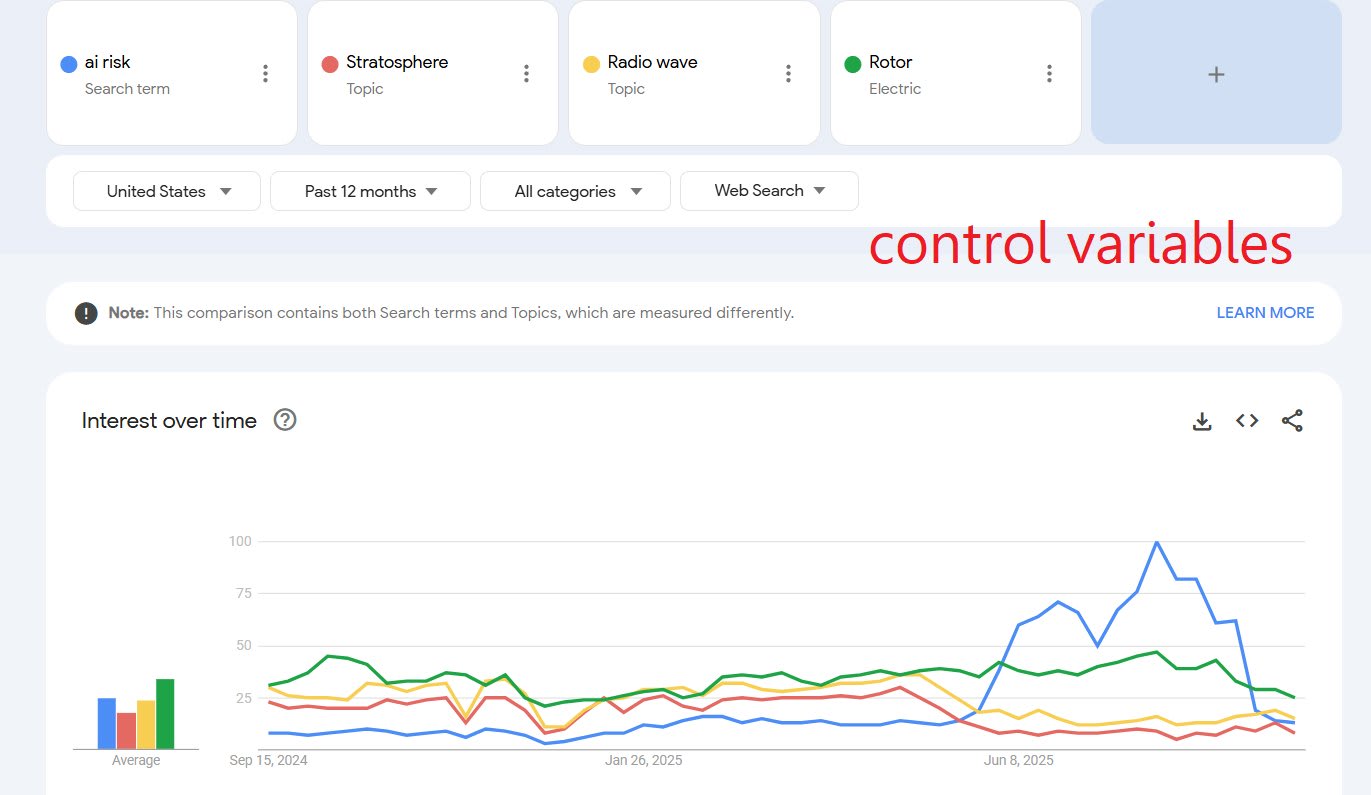 I can't quite dismiss the possibility that the interest was driven by new Chinese AI norms, because Chinese people have to use VPNs, so the geography isn't trustworthy. However, if this were true, I would expect that the number of searches for AI risk in Chinese on Google would be higher than roughly zero (link).