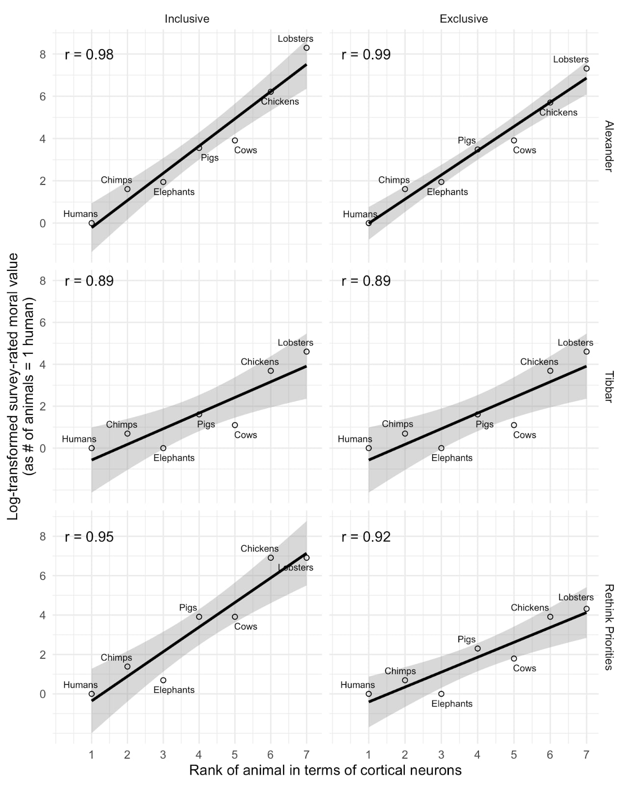 I think this is interesting, but I don't think we should infer too much from this relationship. This plot basically matches those we produced examining the relationship between cortical neuron count and perceived moral value of different animals (replicating SlateStarCodex and another's surveys). As you can see below, we found extremely strong correlations. But we also found similarly strong correlations using EQ or total brain size rather than cortical neuron count, or using a crude 0-100 measure of how people 'care' about the animal in place of tradeoff ratios. Notably, when we replace the moral value measure with a simple ordinal ranking of the animals by neuron count (as in the second plot below), we find even stronger relationships.