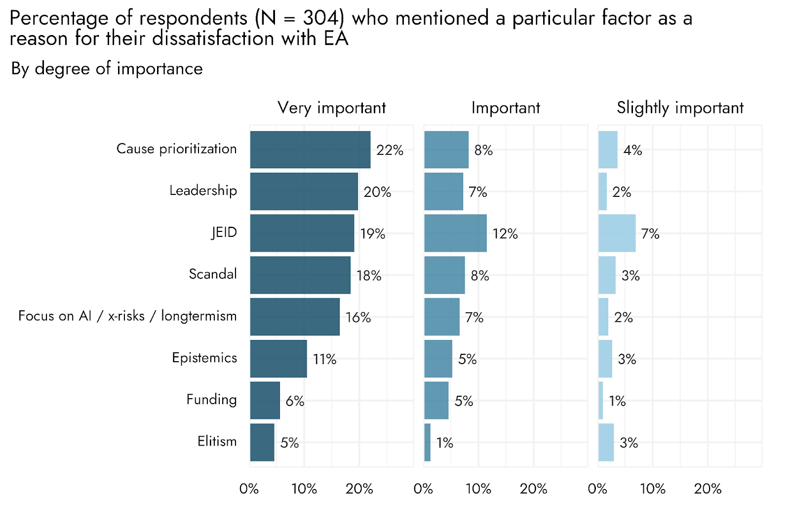 This is in contrast to previous years, where we conducted Exploratory Factor Analysis / Exploratory Graph Analysis of the individual causes, and computed scores corresponding to the "longtermist" (Biosecurity, Nuclear risk, AI risk, X-risk other and Other longtermist) and "neartermist" (Mental health, Global poverty and Neartermist other) groupings we identified. As we discussed in those previous years (e.g. here and here), the terms "longtermist" and "neartermist", as just a matter of simplicity/convenience, matching the common EA understanding of those terms, but people might favour those causes for reasons other than longtermism / neartermism per se, e.g. decision-theoretic or epistemic differences.