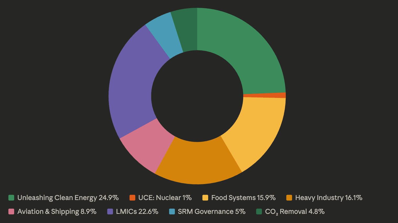 Beyond electricity, we agree that transportation, food systems, and heavy industry are lagging sectors that deserve sustained philanthropic attention. Our portfolio reflects these priorities. The Giving Green Fund is broad: the majority of our planned 2025-2026 allocation supports high-impact nonprofit work on a global scale within food systems, heavy industry, and aviation and shipping. We expect to allocate about an additional quarter of our grantmaking to industry, energy, and possibly land use initiatives that are specifically in low- and middle-income countries. Likewise, our Unleashing Clean Energy—the strategy that encompasses all clean firm technologies—accounts for about a quarter of our portfolio, with nuclear-specific grants representing 1-2%.