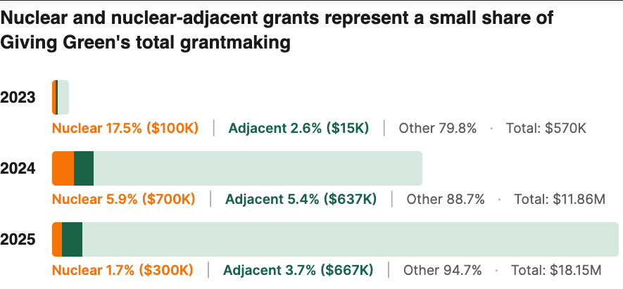 Between 2023 and 2025, Giving Green’s nuclear-specific grants fell from 17.5% of a small $570K portfolio to 1.7% of $18.15M (as of early 2026), a sharp and deliberate shift that captures our evolution in supporting a wide portfolio of promising clean firm power technologies.