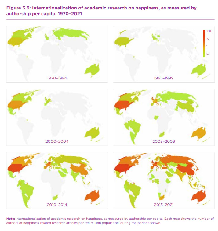 The report goes on to mention the same issue I did in that there are a few early-adopter countries in the field of wellbeing research, but this is becoming more global over time from the ‘earliest mentions’ in the economics literature from the 1970s (they made this comment, not me, hence their graphs starting in 1970):