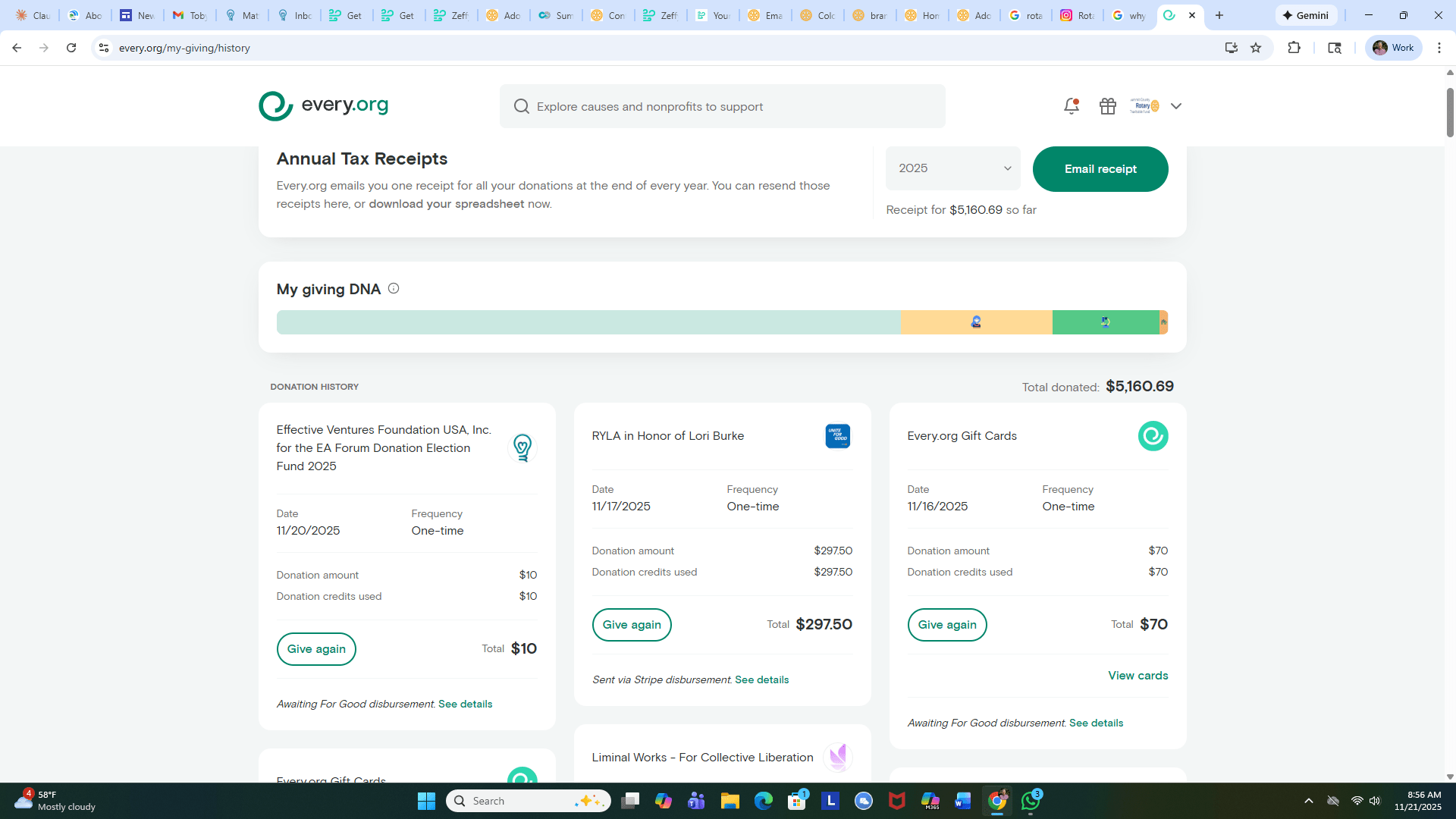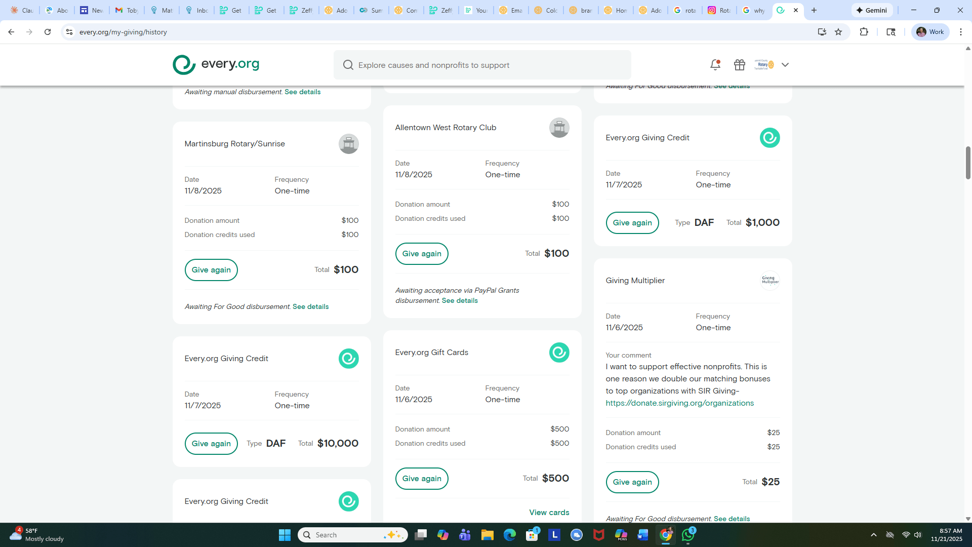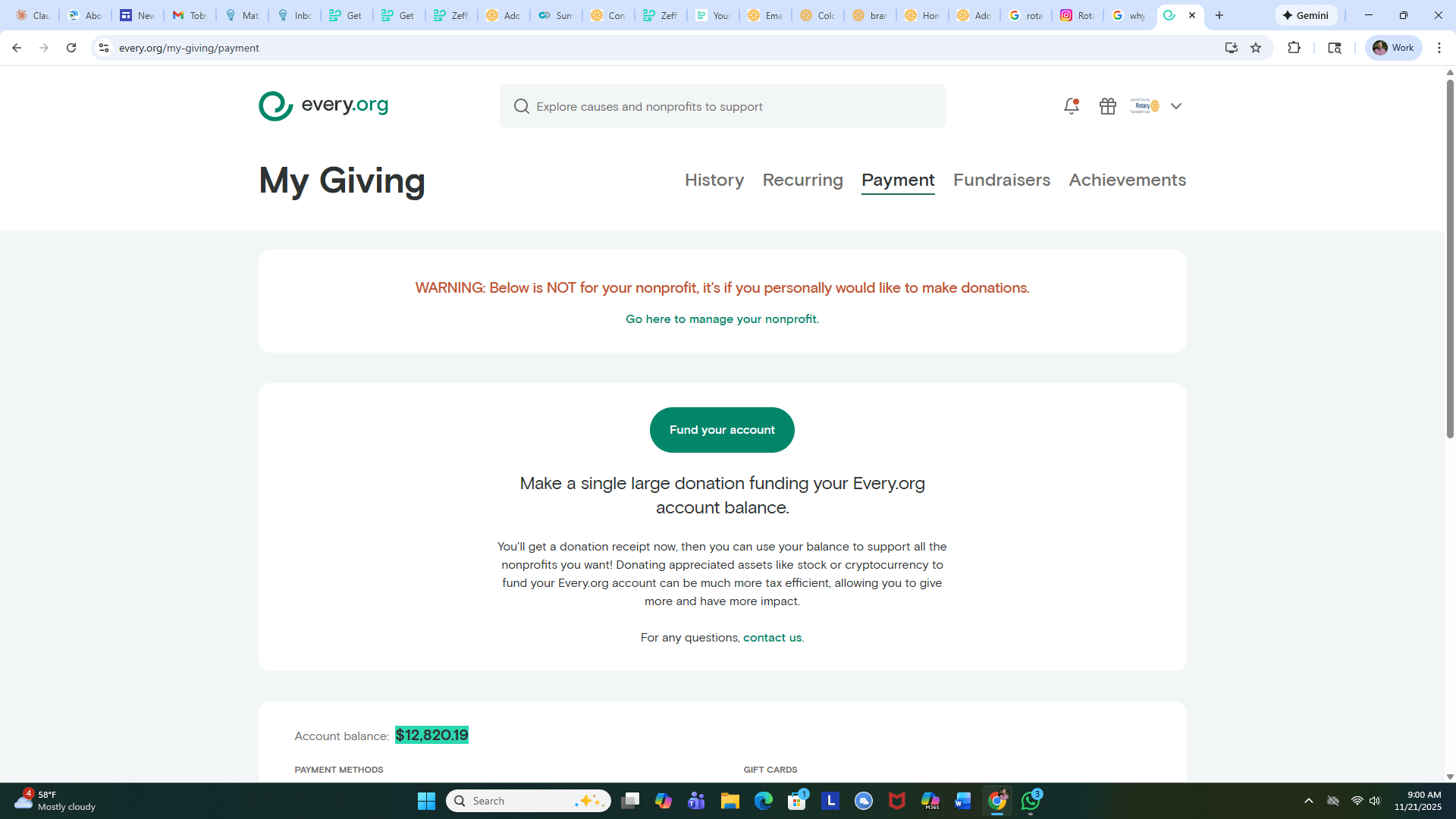Here are a few screen shots from my personal Every.org account which currently has $12,820.19 of Giving Credits available
