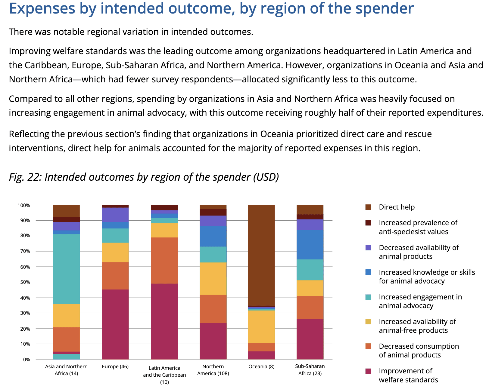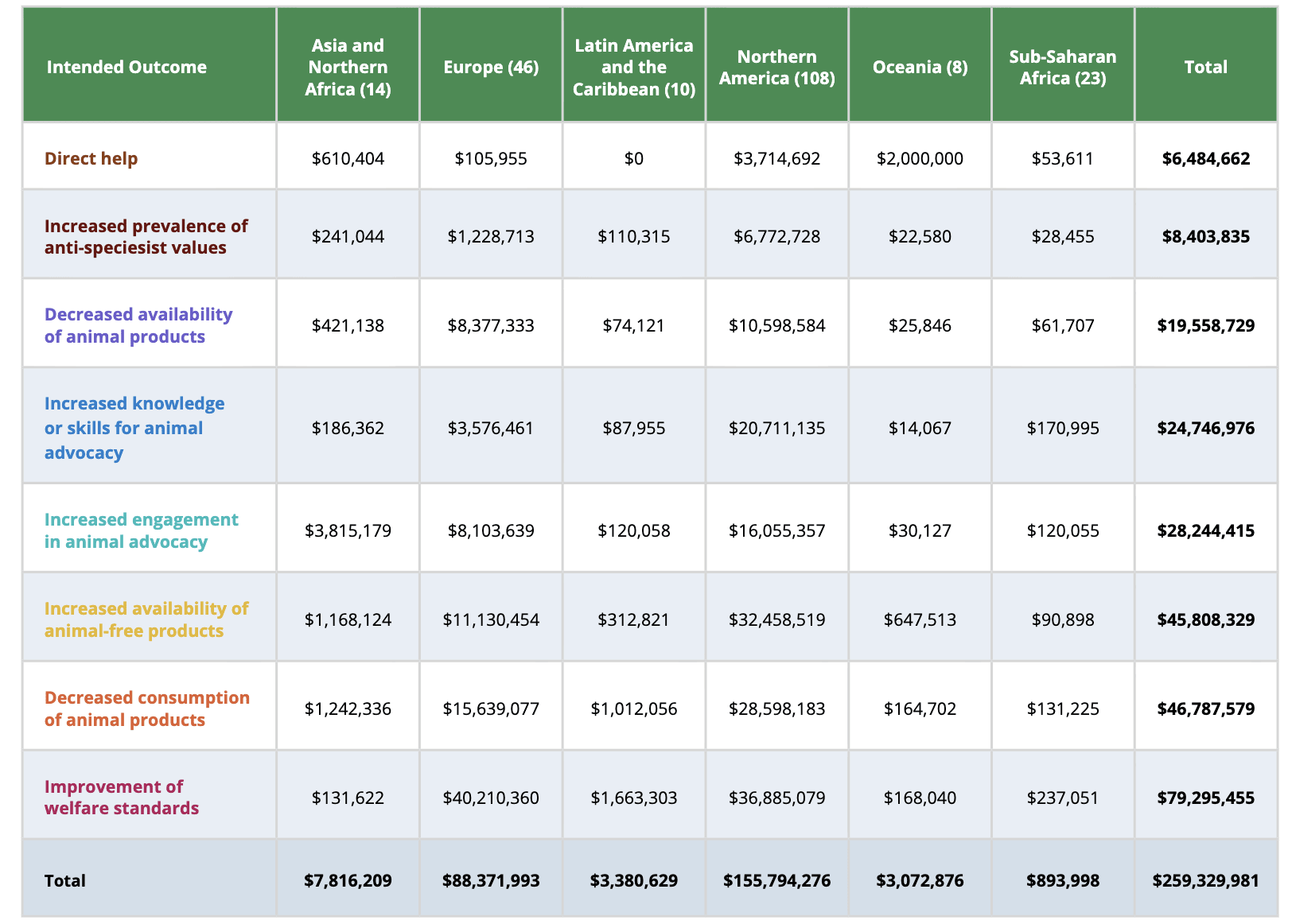 As well as this drill down by intended outcome. Naively it seems that SSA's allocation looks like North America's for instance, except that the latter has a greater proportion of org spending going to increasing availability of animal-free products, which makes sense given relative wealth: