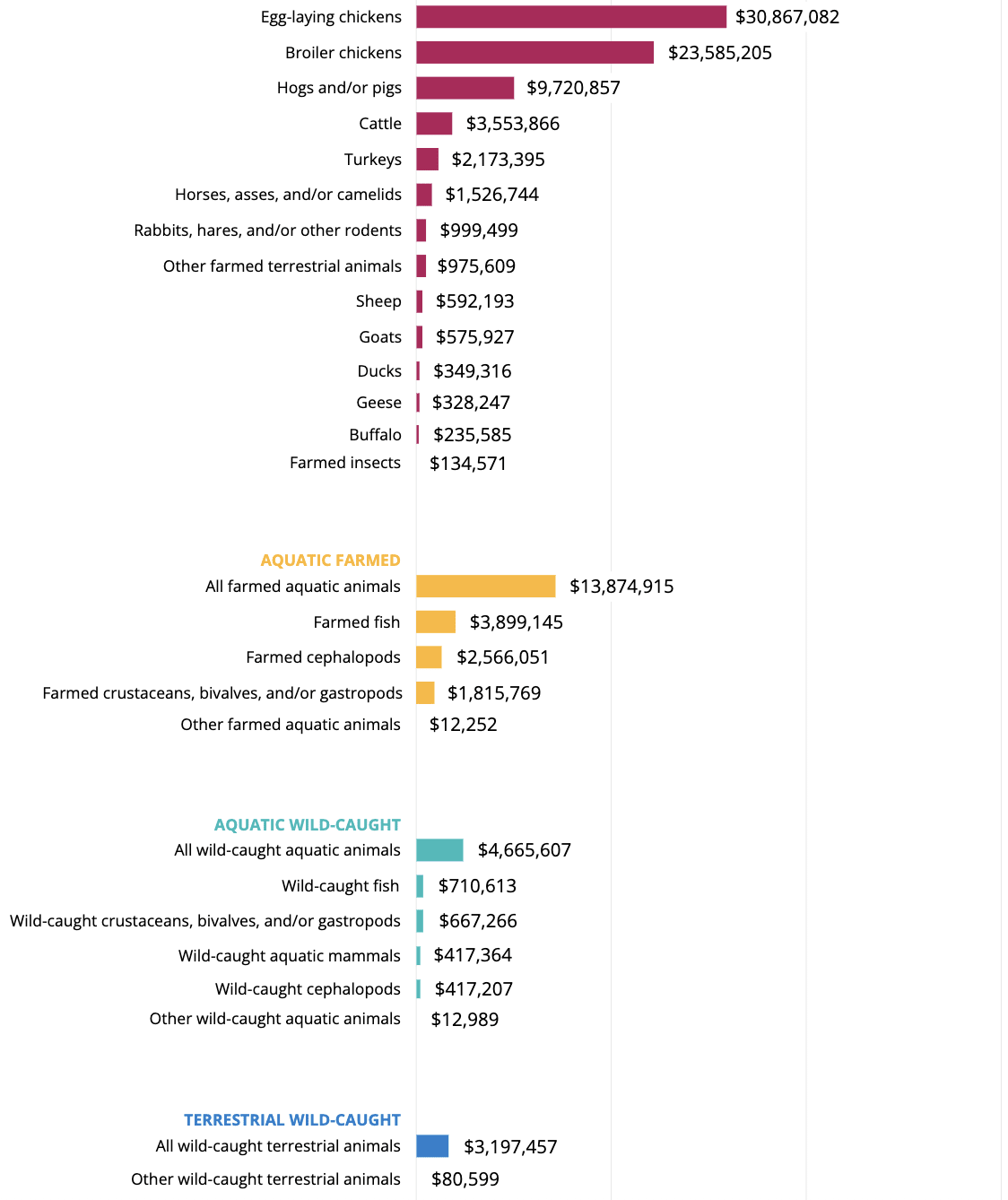 I'd be keen to get takes from folks in the know on what seems underfunded here. Farmed insects jump out: just $135k out of $260m overall (~0.05%) seems nuts.