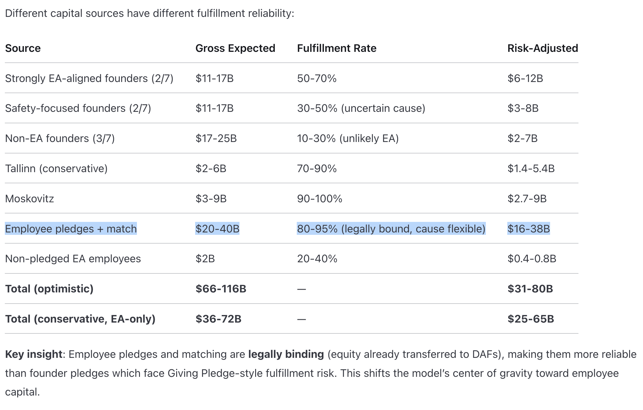 Also, to give Anthropic credit, I want to flag that a bunch of the employee donations are legally binding. Anthropic had a matching program which led to a good amount of money in Donor Advised Funds. https://www.longtermwiki.com/knowledge-base/organizations/funders/anthropic-investors/ (Note that this is also LLM-generated, so meant as a rough guess)