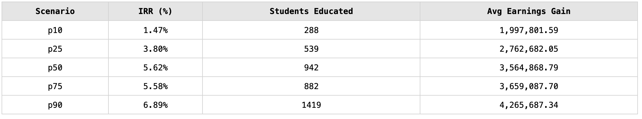 You are right that the cost-effectiveness depends heavily on the recycling of funds. I built two related Monte Carlo simulations to assess the sensitivity of IRR, impact, and students educated to our input parameters. For the sake of brevity, I won't paste the full methodology here (it helps explain the logic behind the sheer number of variables), but I’ve attached a takeaway screenshot below. It shows how many students would be supported over the next 55 years with $1m in recycling investment.