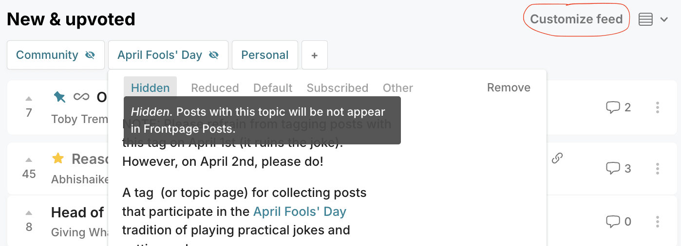 Click on "Customize feed", add "April Fools' Day" by clicking on the + to search for the relevant tag, then click "Hidden".