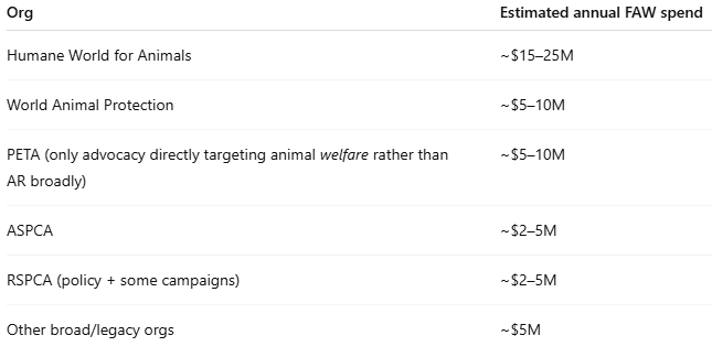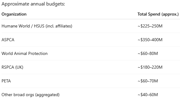 I’ve only recently come to appreciate how large the budgets are for the ASPCA, Humane World (formerly HSUS), and similar large, broad-based animal charities. At a quick (LLM) scan of their public filings, they appear to have a combined annual budget of ~$1Bn, most of which is focused on companion animals.